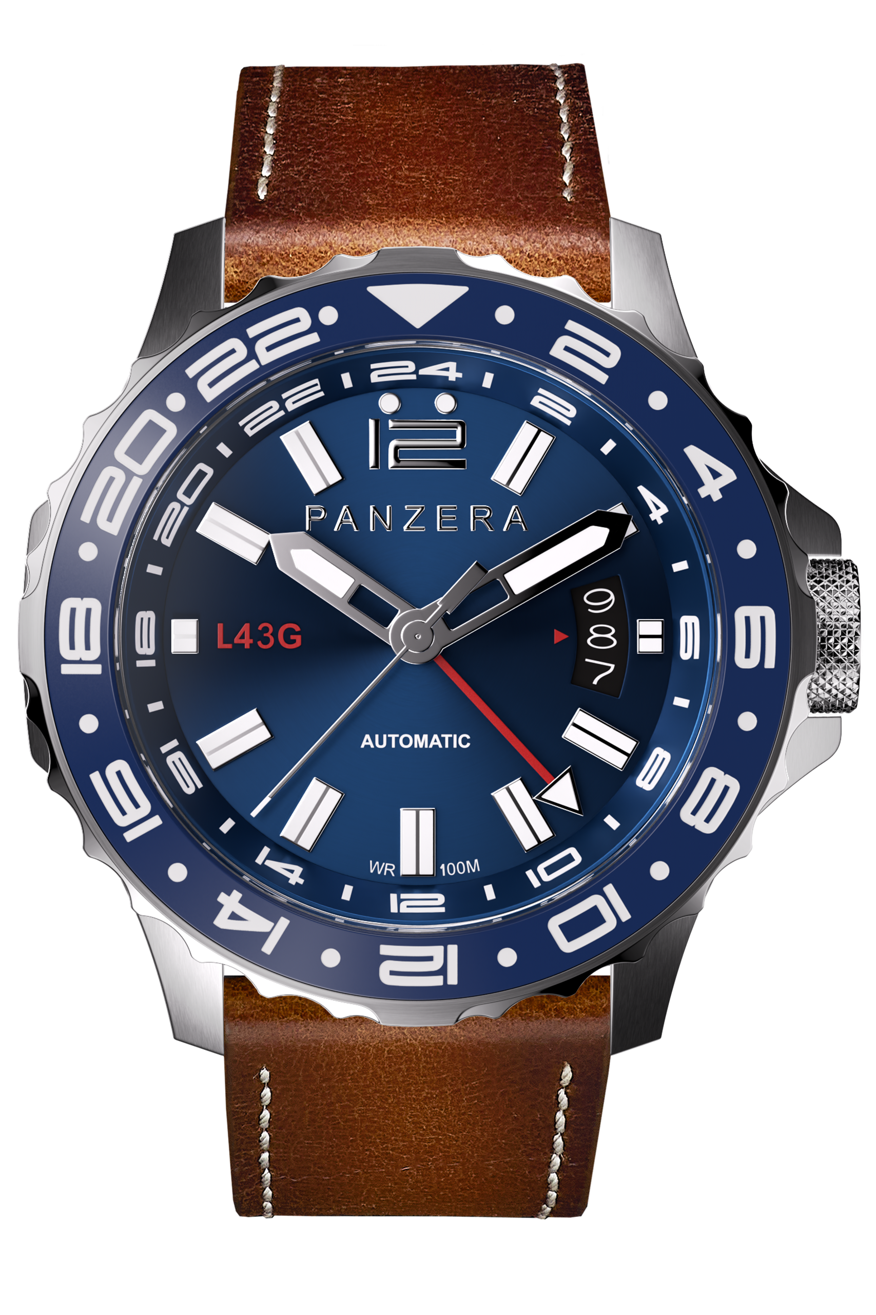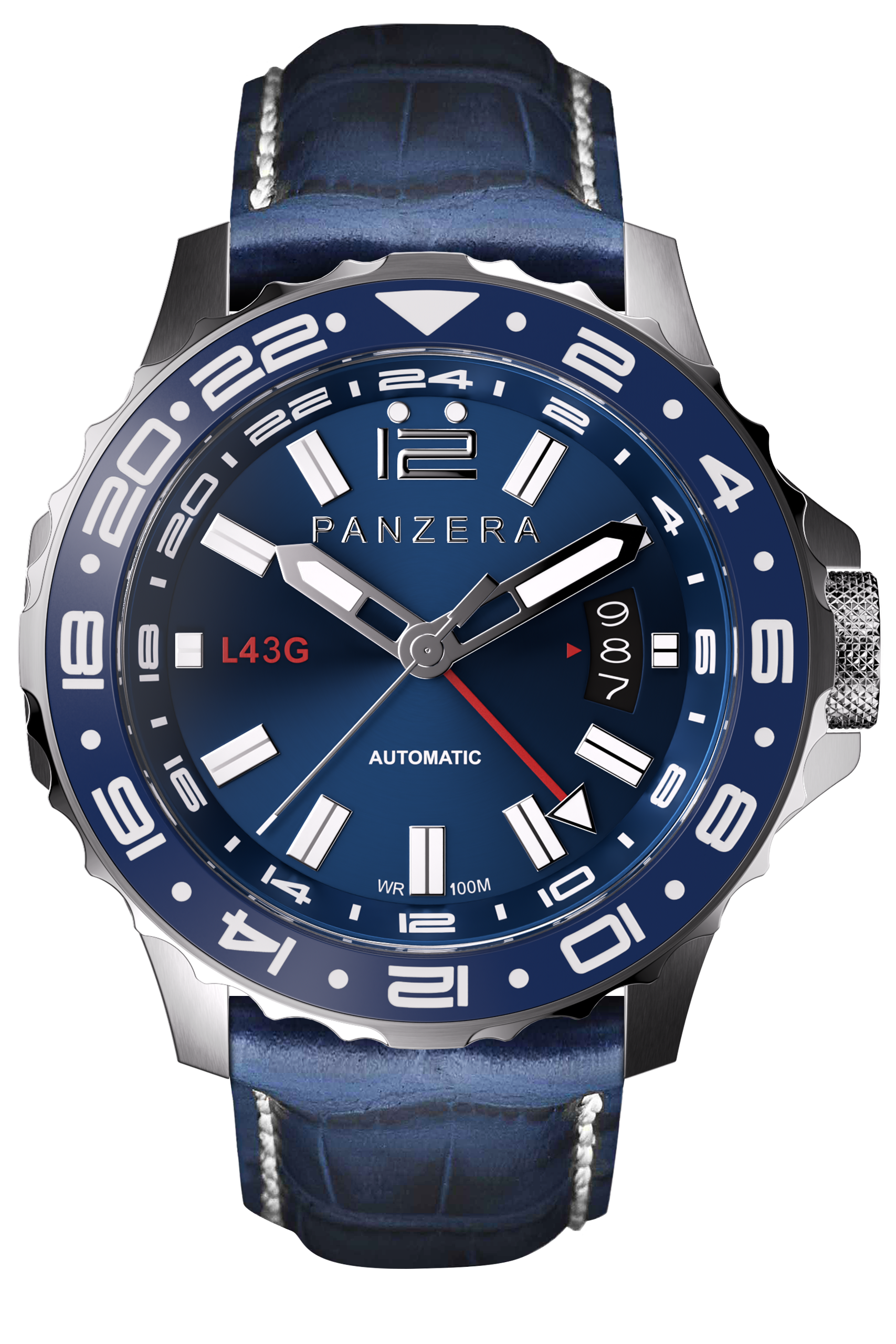 The PANZERA LONGREACH 43G Blue Dial & Silver Case is a modern pilot’s watch engineered for global travellers who demand precision, versatility, and timeless design. Confidently sized at 43mm, this automatic timepiece pairs classic aviation aesthetics with contemporary GMT performance.