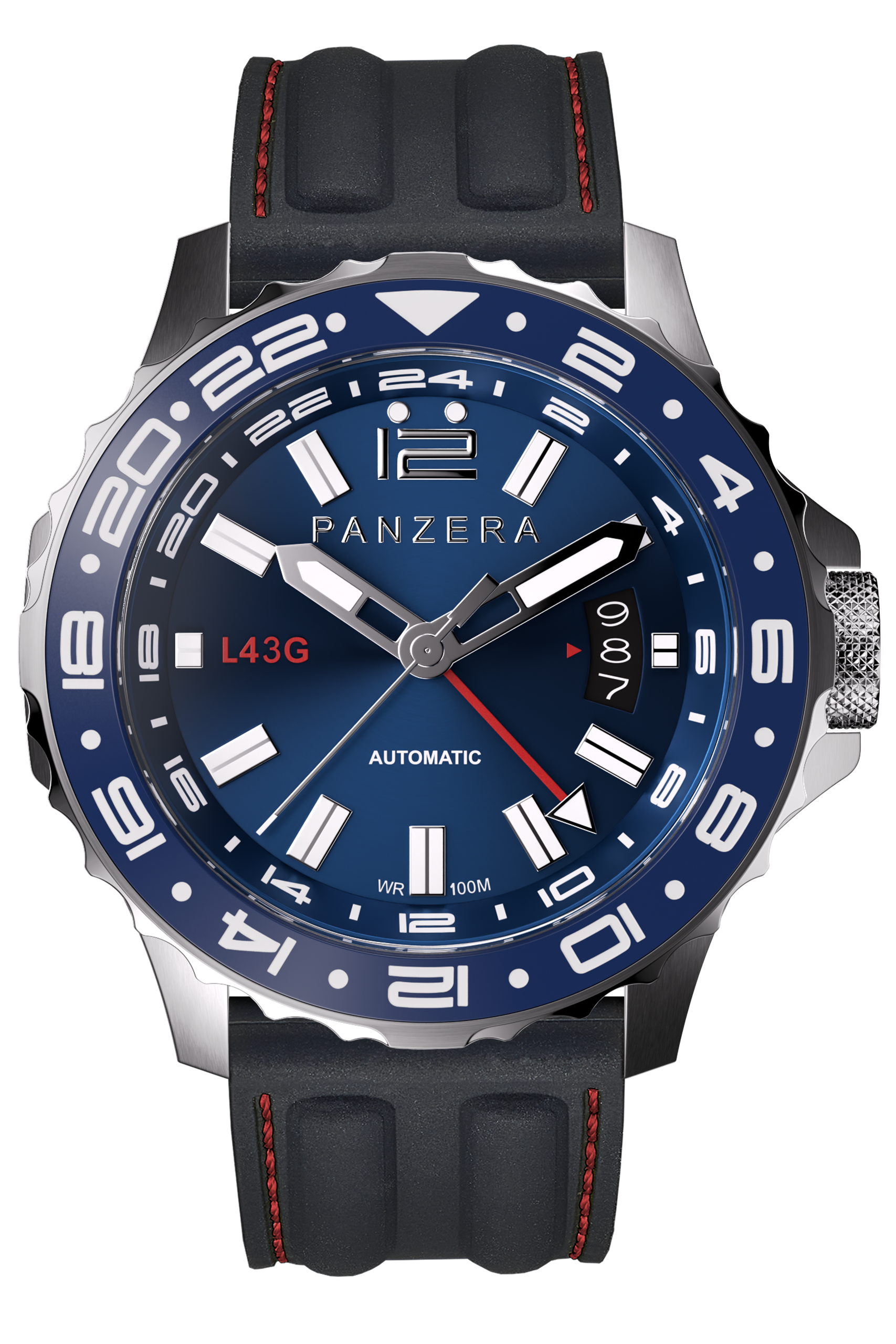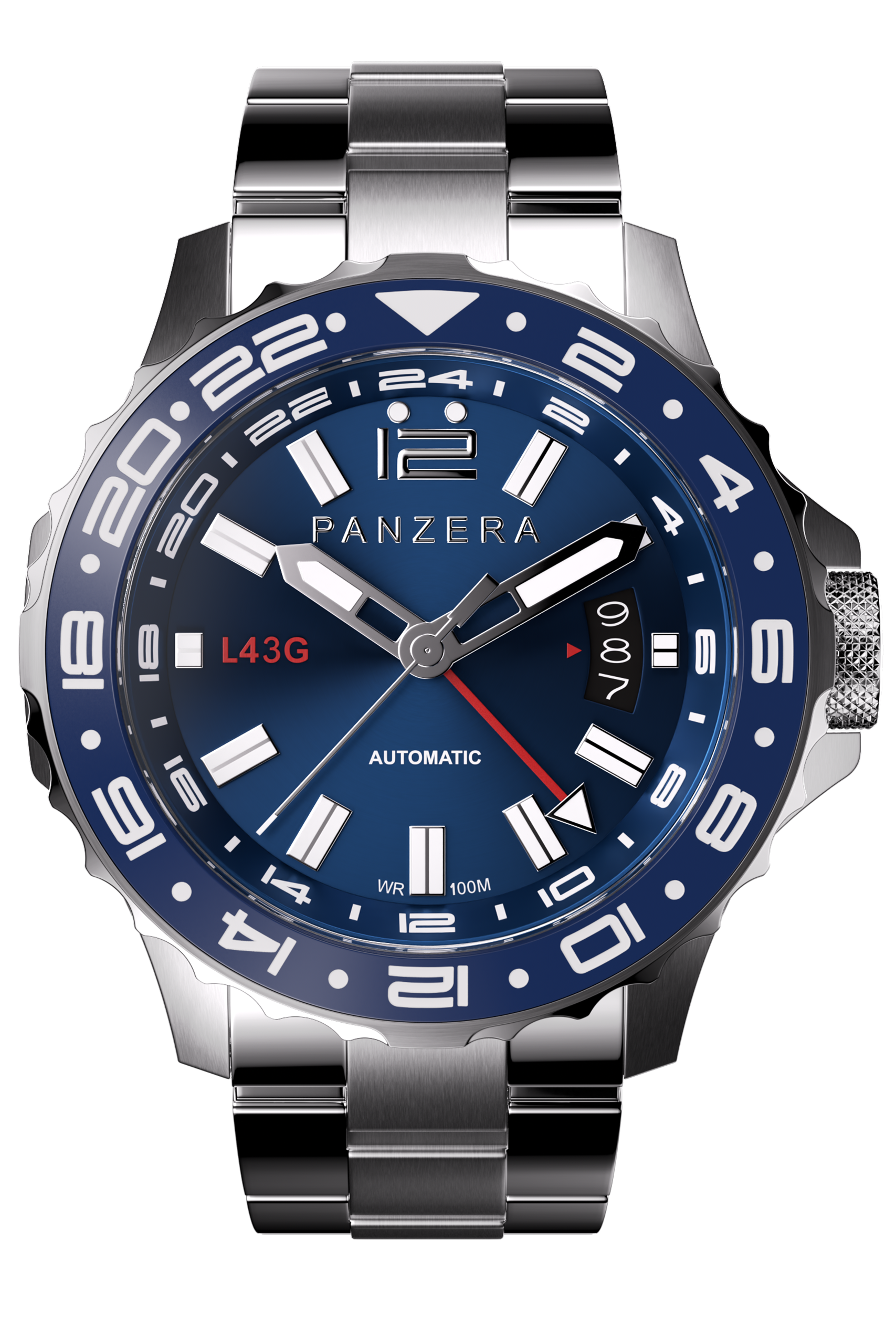 The dark blue dial and bezel delivers exceptional contrast and legibility, framed by a robust 316L stainless steel silver case and protected by scratch-resistant sapphire crystal and bi-directional rotating ceramic bezel. Designed to perform across time zones and environments, the LONGREACH 43G transitions seamlessly from cockpit to boardroom.