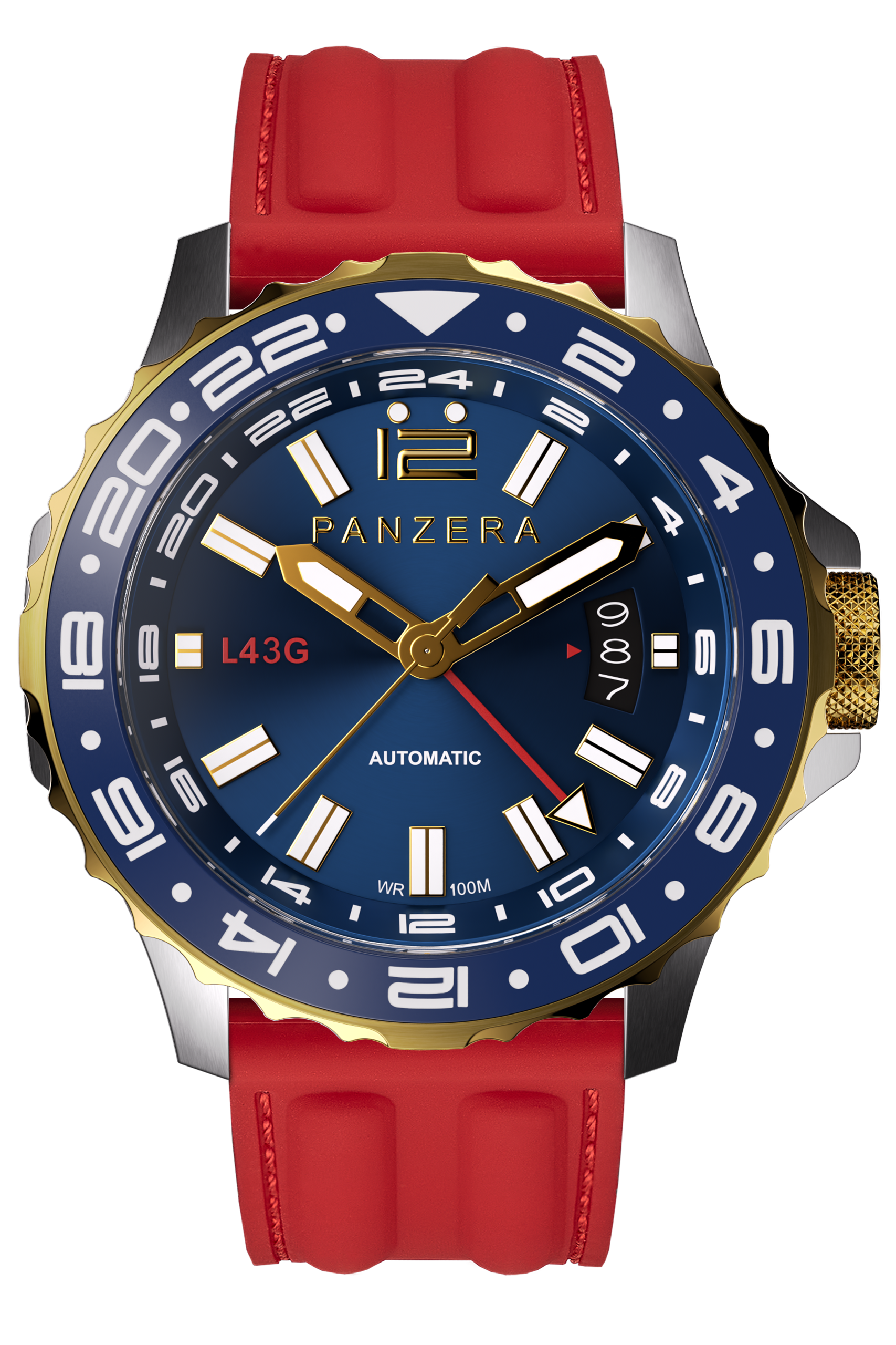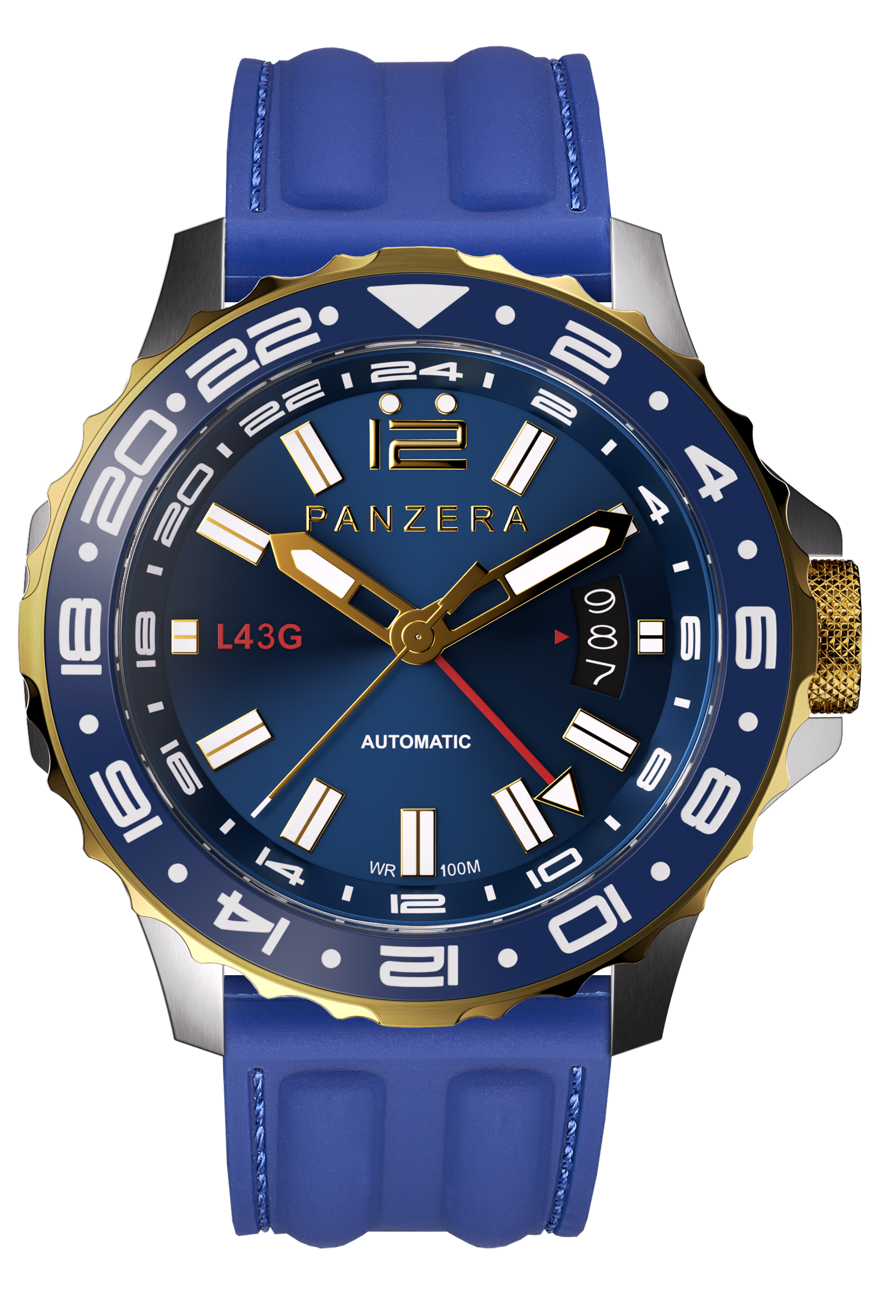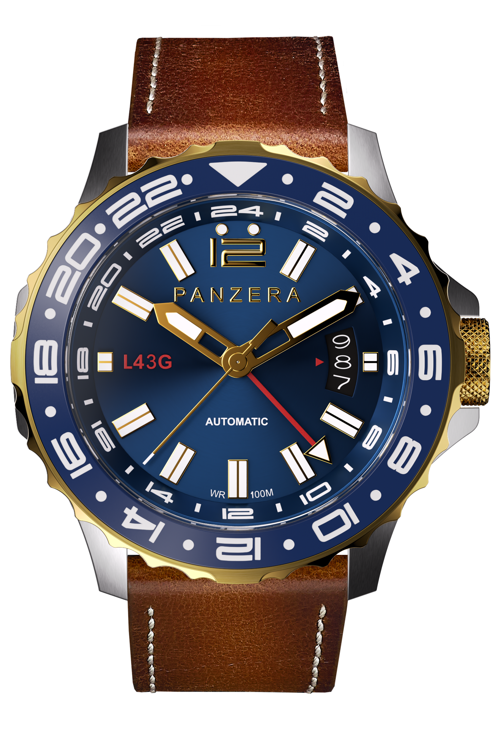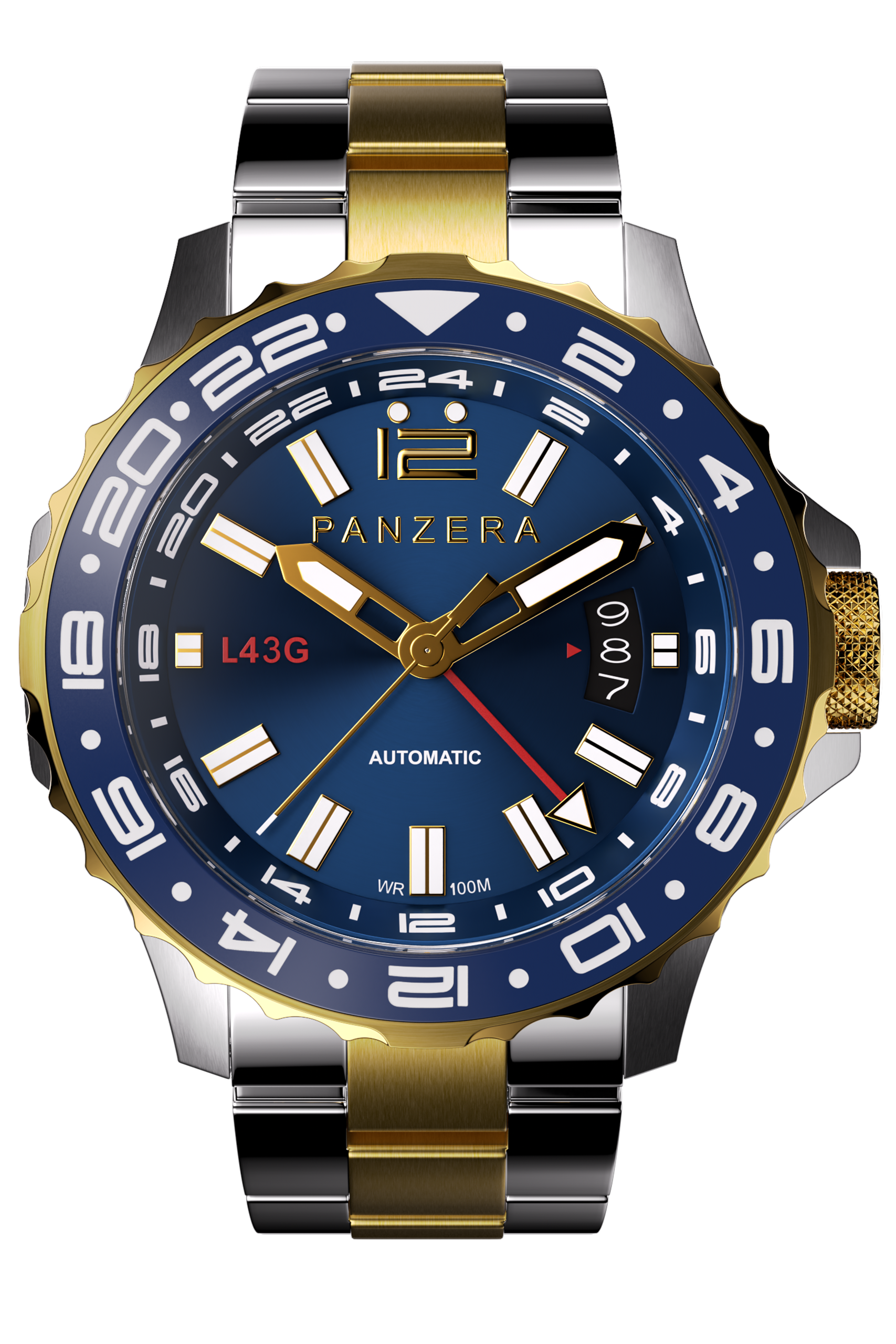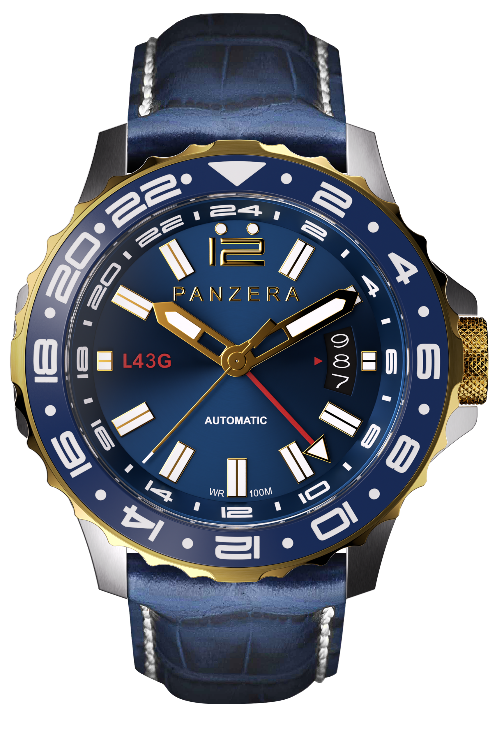 The PANZERA LONGREACH 43G Blue Dial with Two Tone Gold & Silver Case is a modern pilot’s watch engineered for global travellers who demand precision, versatility, and timeless design. Confidently sized at 43mm, this automatic timepiece pairs classic aviation aesthetics with contemporary GMT performance.