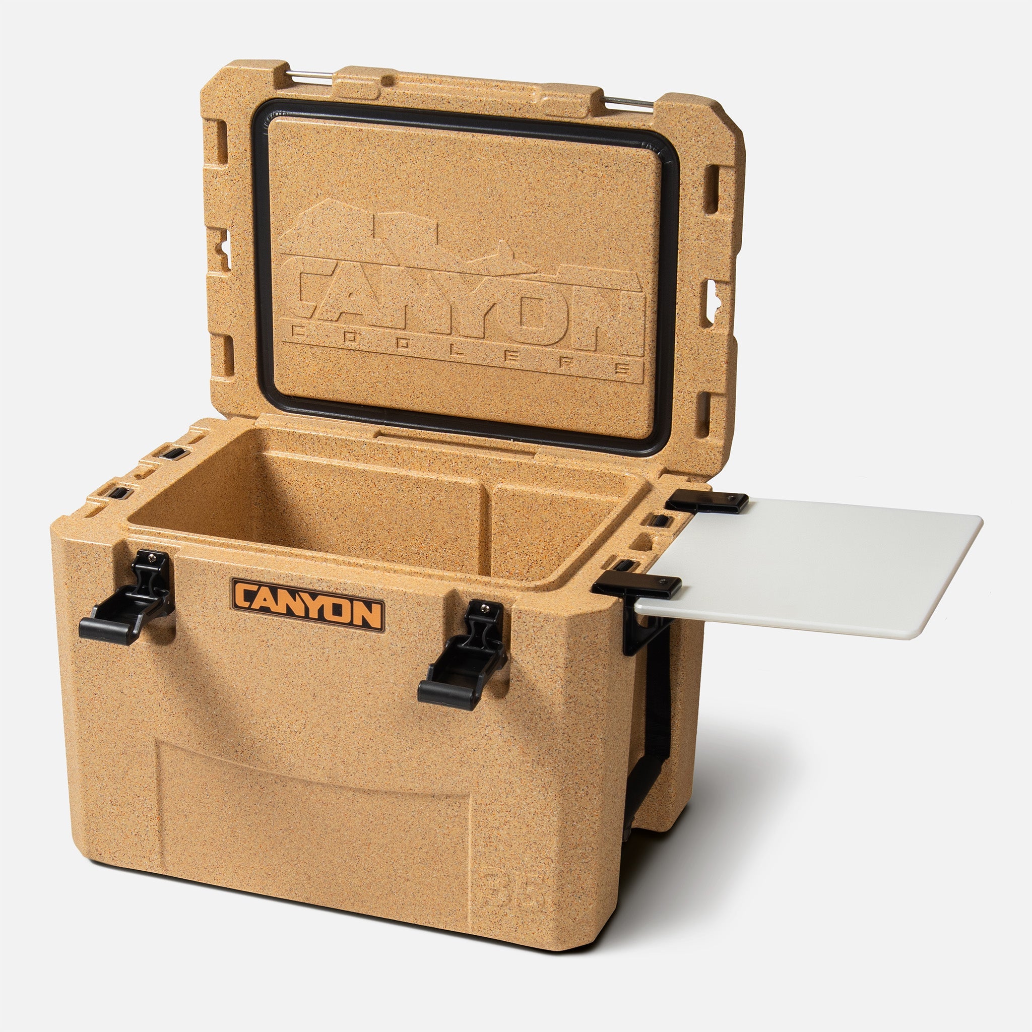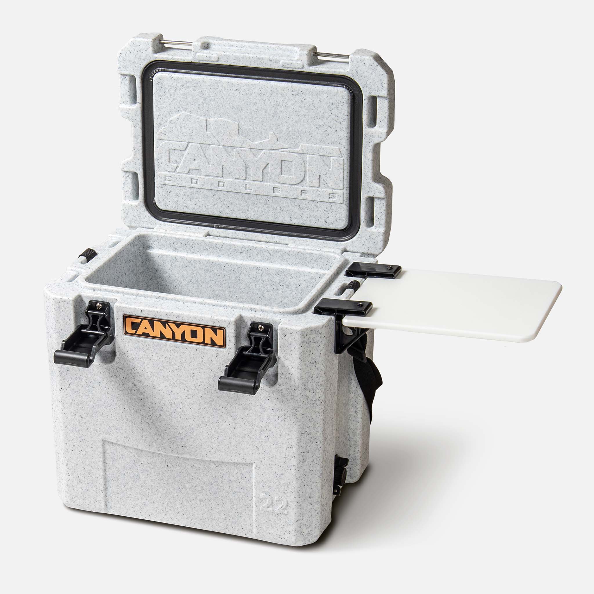 Please be aware, the table for the 22 is not a divider and rests on the top rail inside the cooler. The 35,55,and75 function as both a divider and side table.